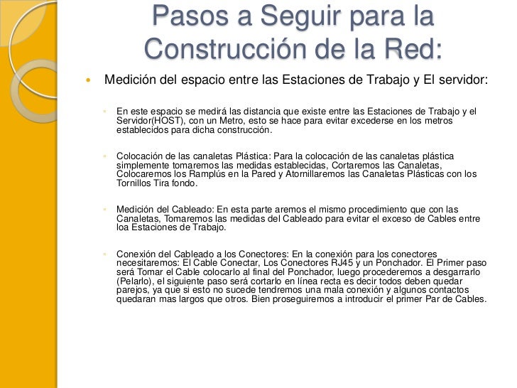 - 3. Pasos a Seguir para la Construcción de la Red: Medición del espacio entre las Estaciones de Trabajo y El servidor: ◦ En este espacio se medirá las distancia que existe entre las Estaciones de Trabajo y el Servidor(HOST), con un Metro, esto se hace para evitar excederse en los metros establecidos para dicha construcción. ◦ Colocación de las canaletas Plástica: Para la colocación de las canaletas plástica simplemente tomaremos las medidas establecidas, Cortaremos las Canaletas, Colocaremos los Ramplús en la Pared y Atornillaremos las Canaletas Plásticas con los Tornillos Tira fondo. ◦ Medición del Cableado: En esta parte aremos el mismo procedimiento que con las Canaletas, Tomaremos las medidas del Cableado para evitar el exceso de Cables entre loa Estaciones de Trabajo. ◦ Conexión del Cableado a los Conectores: En la conexión para los conectores necesitaremos: El Cable Conectar, Los Conectores RJ45 y un Ponchador. El Primer paso será Tomar el Cable colocarlo al final del Ponchador, luego procederemos a desgarrarlo (Pelarlo), el siguiente paso será cortarlo en línea recta es decir todos deben quedar parejos, ya que si esto no sucede tendremos una mala conexión y algunos contactos quedaran mas largos que otros. Bien proseguiremos a introducir el primer Par de Cables.