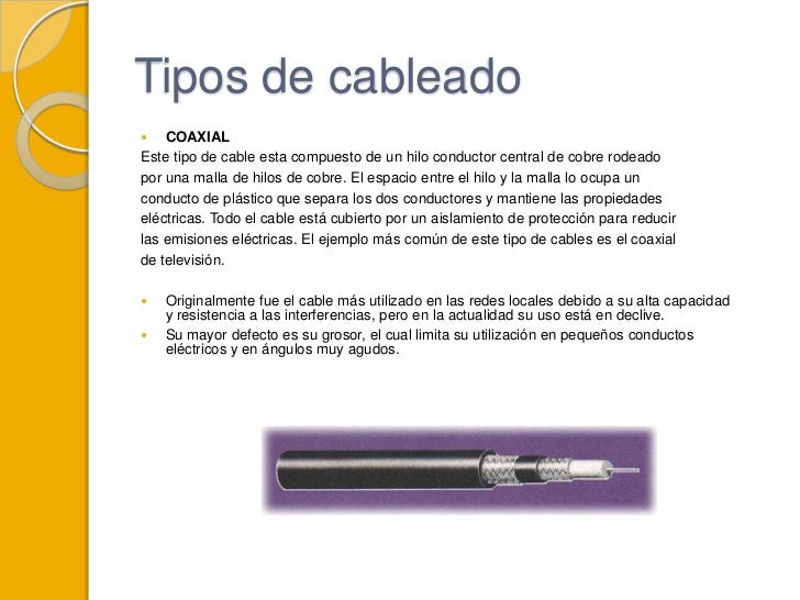 - 4. Tipos de cableado COAXIALEste tipo de cable esta compuesto de un hilo conductor central de cobre rodeadopor una malla de hilos de cobre. El espacio entre el hilo y la malla lo ocupa unconducto de plástico que separa los dos conductores y mantiene las propiedadeseléctricas. Todo el cable está cubierto por un aislamiento de protección para reducirlas emisiones eléctricas. El ejemplo más común de este tipo de cables es el coaxialde televisión. Originalmente fue el cable más utilizado en las redes locales debido a su alta capacidad y resistencia a las interferencias, pero en la actualidad su uso está en declive. Su mayor defecto es su grosor, el cual limita su utilización en pequeños conductos eléctricos y en ángulos muy agudos.