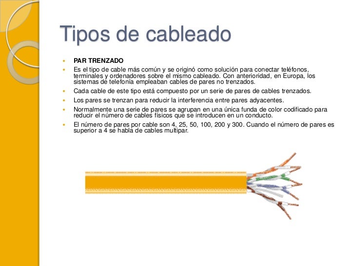 - 5. Tipos de cableado PAR TRENZADO Es el tipo de cable más común y se originó como solución para conectar teléfonos, terminales y ordenadores sobre el mismo cableado. Con anterioridad, en Europa, los sistemas de telefonía empleaban cables de pares no trenzados. Cada cable de este tipo está compuesto por un serie de pares de cables trenzados. Los pares se trenzan para reducir la interferencia entre pares adyacentes. Normalmente una serie de pares se agrupan en una única funda de color codificado para reducir el número de cables físicos que se introducen en un conducto. El número de pares por cable son 4, 25, 50, 100, 200 y 300. Cuando el número de pares es superior a 4 se habla de cables multipar.