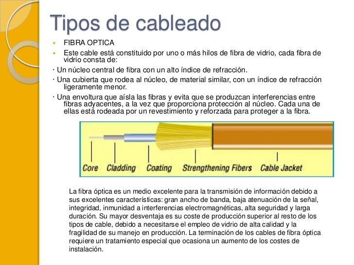 - 6. Tipos de cableado FIBRA OPTICA Este cable está constituido por uno o más hilos de fibra de vidrio, cada fibra de vidrio consta de:· Un núcleo central de fibra con un alto índice de refracción.· Una cubierta que rodea al núcleo, de material similar, con un índice de refracción ligeramente menor.· Una envoltura que aísla las fibras y evita que se produzcan interferencias entre fibras adyacentes, a la vez que proporciona protección al núcleo. Cada una de ellas está rodeada por un revestimiento y reforzada para proteger a la fibra. La fibra óptica es un medio excelente para la transmisión de información debido a sus excelentes características: gran ancho de banda, baja atenuación de la señal, integridad, inmunidad a interferencias electromagnéticas, alta seguridad y larga duración. Su mayor desventaja es su coste de producción superior al resto de los tipos de cable, debido a necesitarse el empleo de vidrio de alta calidad y la fragilidad de su manejo en producción. La terminación de los cables de fibra óptica requiere un tratamiento especial que ocasiona un aumento de los costes de instalación.
